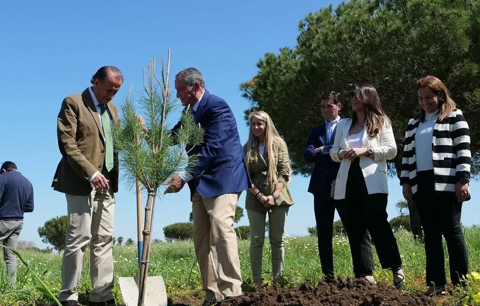 El alcalde de Chiclana, José María Román, y el gerente de Moneleg, Francisco Guerrero, han presidido el acto de plantación de árboles, pinos concretamente, que la empresa chiclanera hace con motivo de su 40 aniversario, siendo la propia entidad la que se hará cargo del mantenimiento de esta plantación.